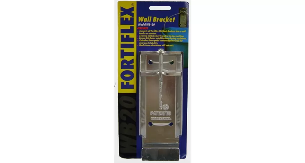 Patented aluminum bracket specially designed to hold flat back buckets securely against a wall or post, indoors or outdoors. Bail pin locks bucket in tip-free position.