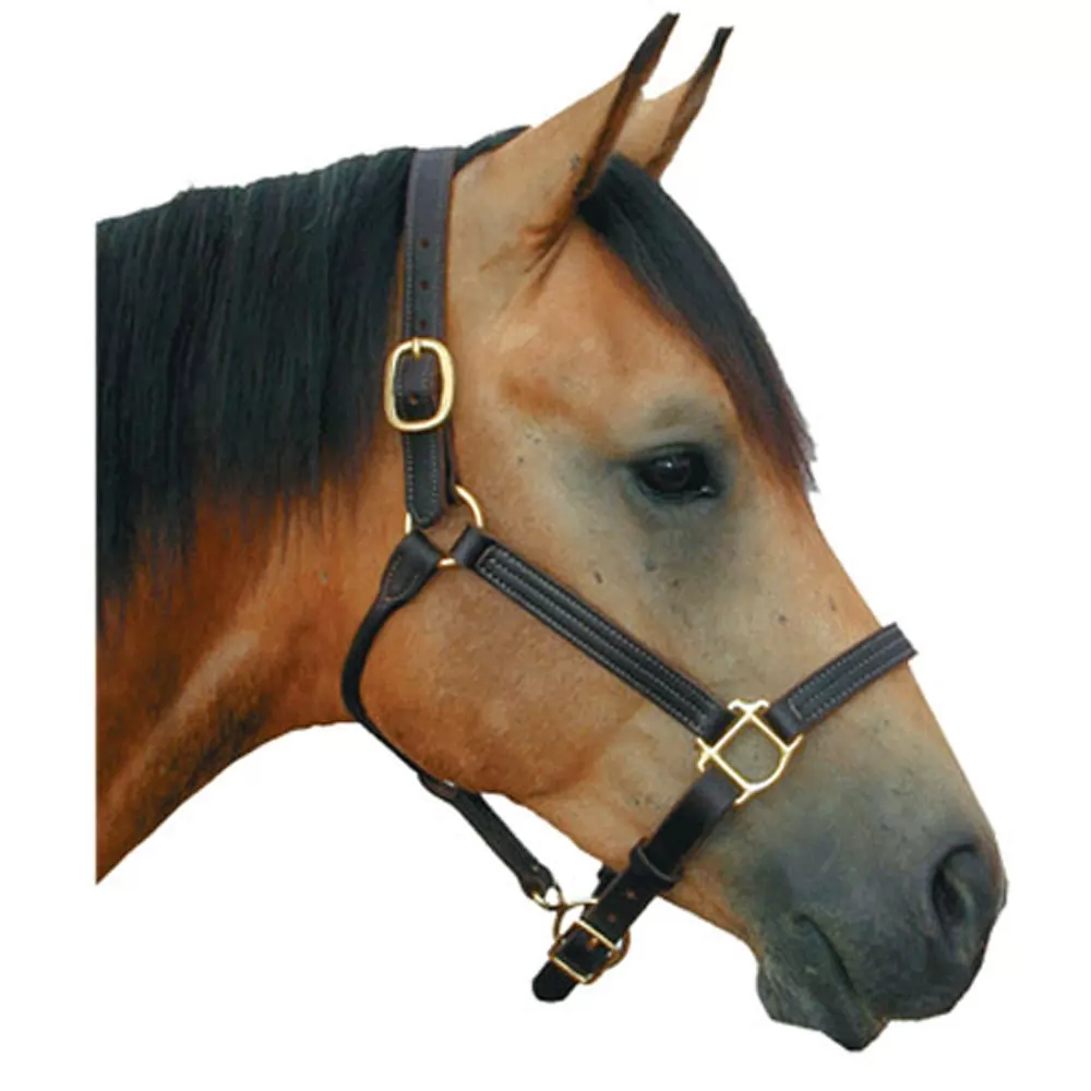 The Deluxe leather track halter features 1″ leather with crown buckles on each side. Adjustable chin, rolled throat with snap. Triple stitched. Solid brass hardware. Black or Brown.