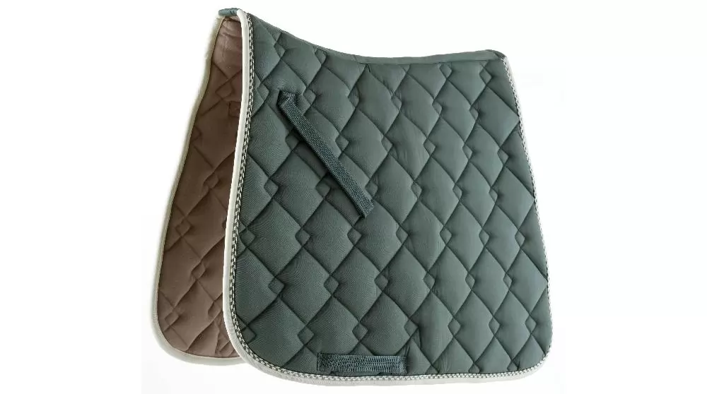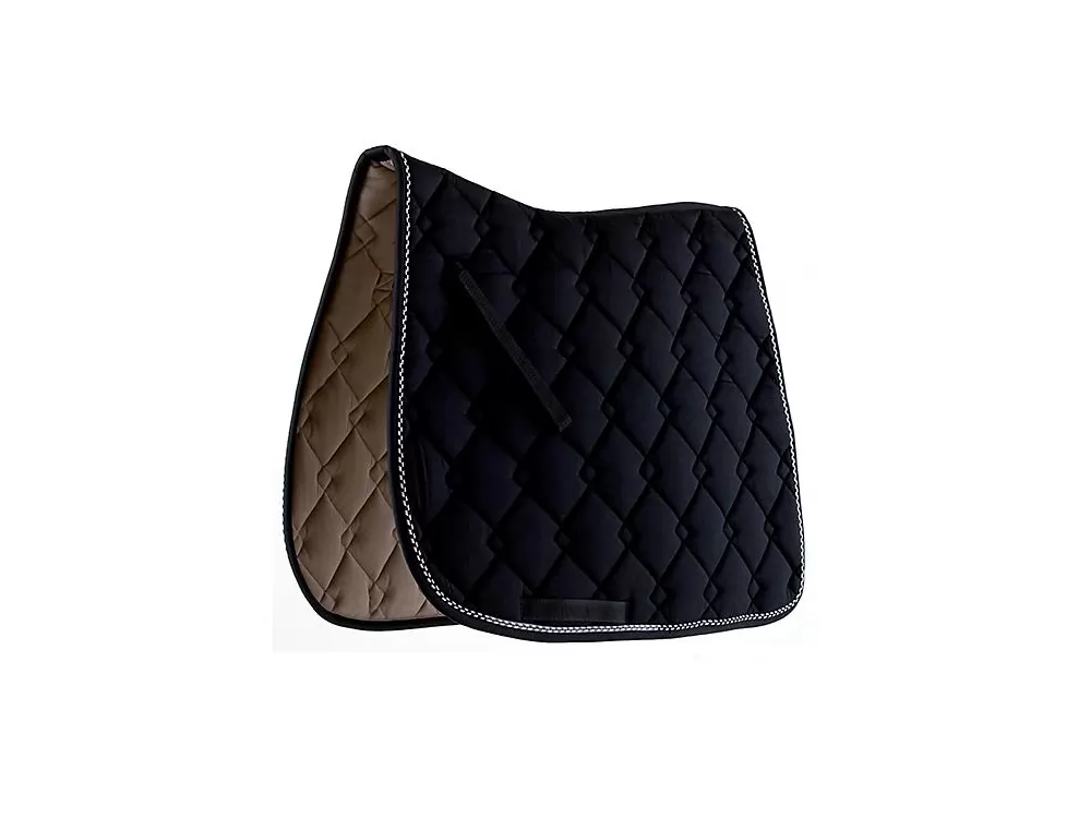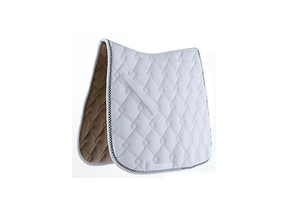 The Ecole by Roma Dressage Double Diamond Quilt is made of a substantial cotton fabric with a fancy single braiding. This pad has a cushioned micro-trico lining that wicks away moisture from your horses total comfort and a girth guard that will keep the pad looking neat and new longer.