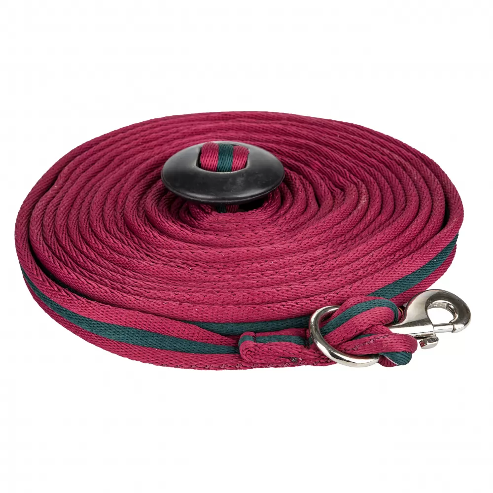 A classic lunge line constructed of a soft cotton web. Features a nickel-plated snap and a hand hold. Great for any barn or trailer.