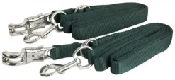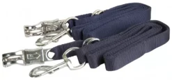 A pair of classically designed Cross Ties constructed of a heavy duty single ply Nylon. Features a nickel plated snap at one end and a nickel plated quick release at the other end. Completely adjustable from 5′ to 9′. Cross Ties are a necessity for the aisleway or washstall. Also a great item to take along to horse shows when you are stabling for grooming and tacking up.