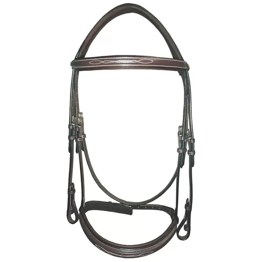Make a statement with this beautiful wide noseband mono style bridle from HDR. Featuring a mono crown, fancy stitch detail and a padded, contoured headstall, this bridle offers superior quality leather at an unbeatable price. Includes leather braided reins and available in the Australian Nut color.