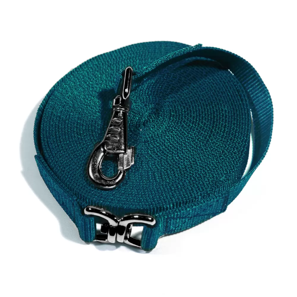 The Kensington 30 feet long flat nylon lunge line allows for maximum mobility and control. It features a heavy duty swivel brass plated bolt snap connector, an extra swivel 6 inches down the rope to prevent the line from tangling along with a looped handle.