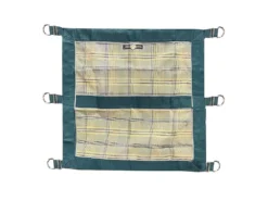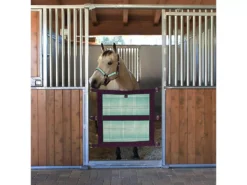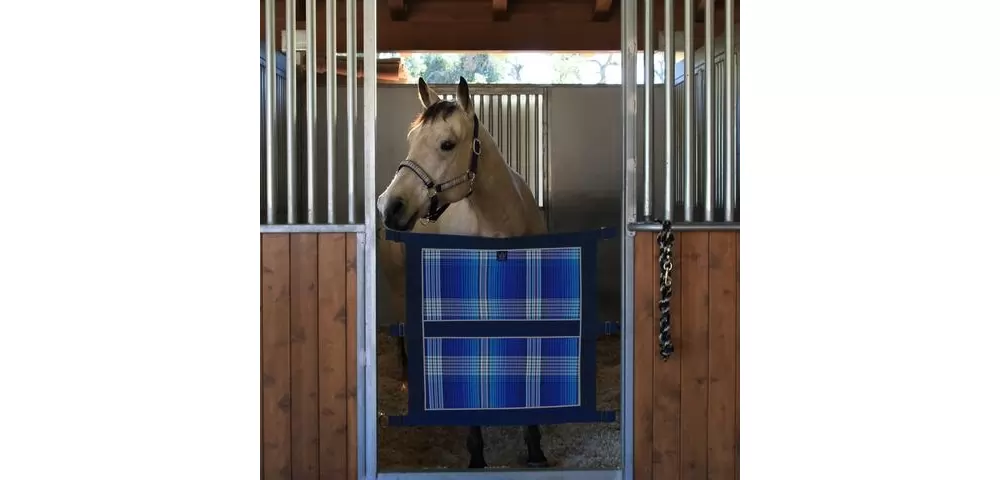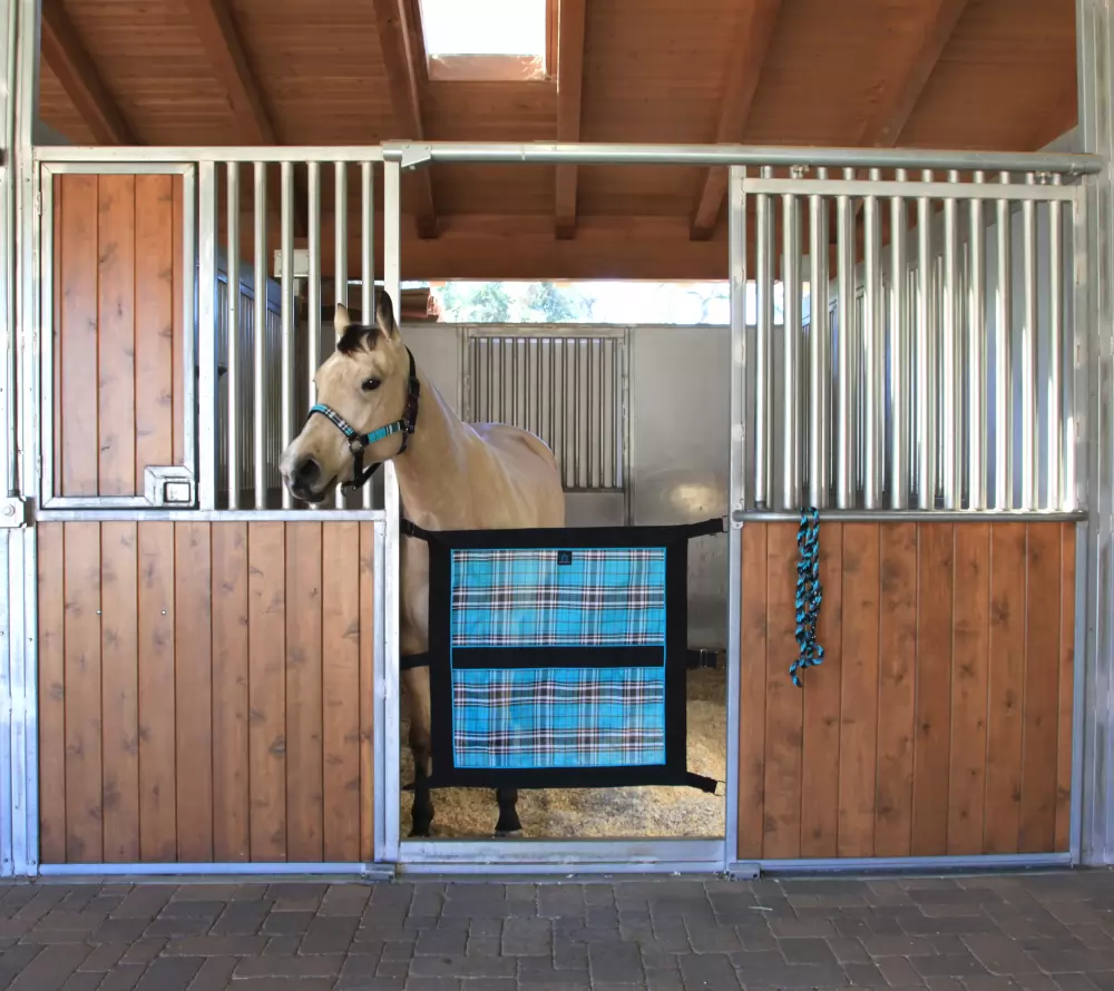STALL DOOR GUARD WITH HARDWARE – Add a touch of elegance to your stall door opening and keep your horse safely in the stall. Made of durable Textilene mesh and bordered on all 4 sides with 3 nylon webbing. A generous 34 1/2 inches long by 36 inches wide this guard is adjustable to fit openings up to 47 wide using the adjustment straps. Beautiful coordinating hardware completes the look and includes 6sets)3 on each side) heavy-duty D rings for easy fastening, double ended snaps and screw eye for attaching to the barn door. The solid web center is ideal for personalization. (Includes all hardware)