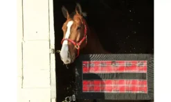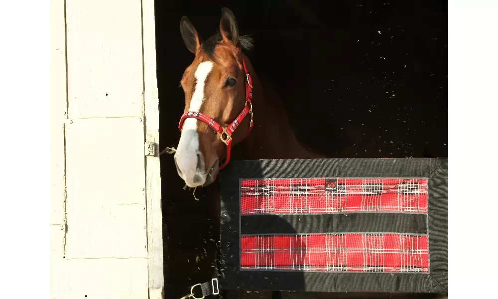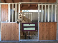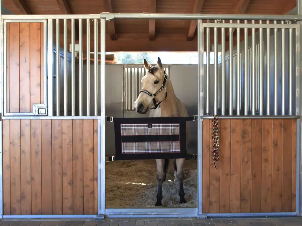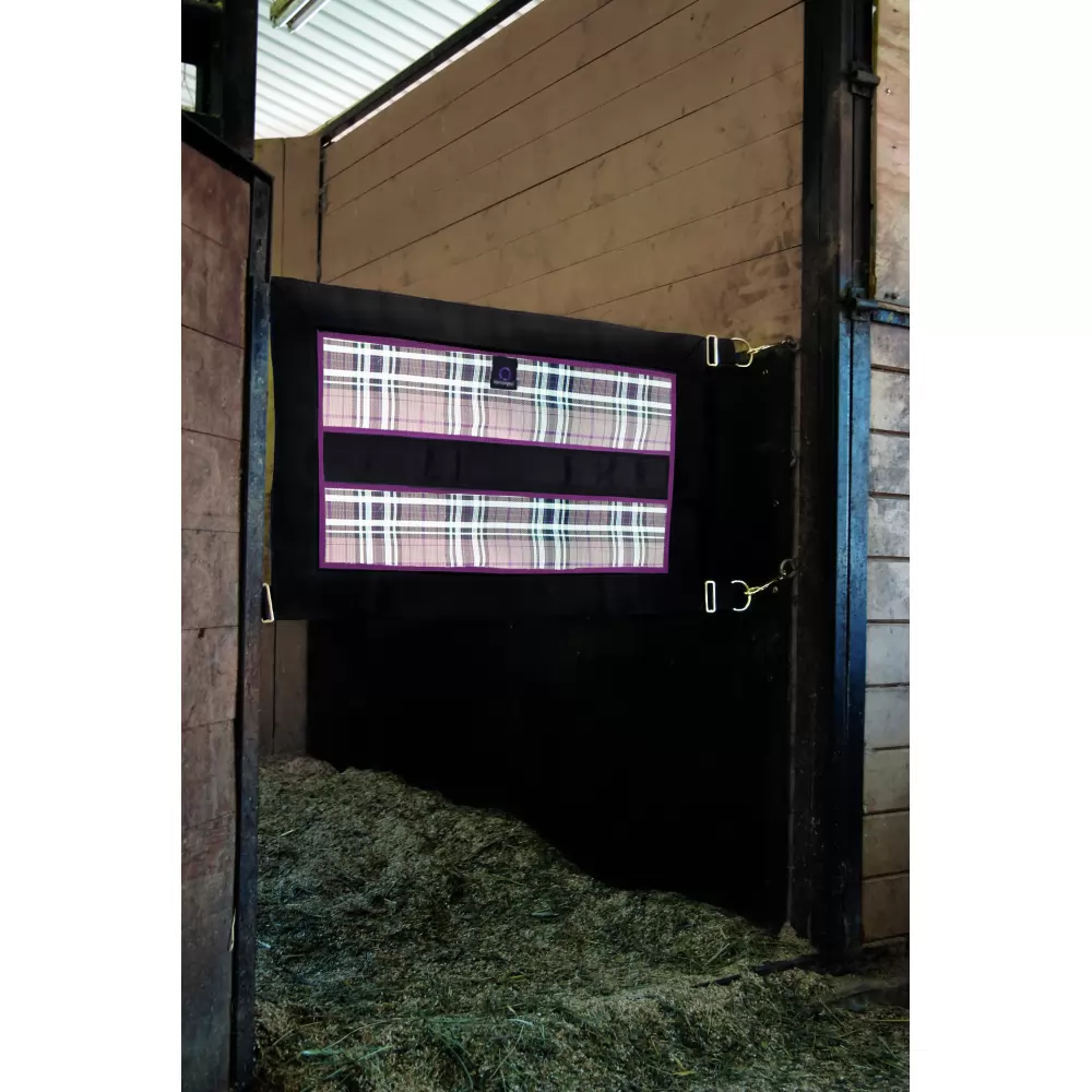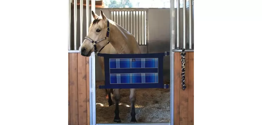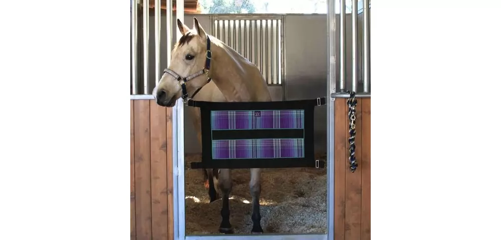 Kensington Stall Guard – ALL HARDWARE INCLUDED – 4 DOUBLE ENDED SNAPS AND SCREW EYES. Add a touch of elegance to your stall door opening and keep your horse safely in the stall. Made of durable Textilene mesh and bordered on all 4 sides with 3 inch nylon webbing. A generous 34 1/2 inches long by 21 inches wide this guard is adjustable to fit openings up to 47 inches wide using the adjustment straps. Beautiful coordinating hardware completes the look and includes heavy-duty D rings for easy fastening, double ended snaps and screw eye for attaching to the barn door. The solid web center is ideal for personalization. Includes all hardware. Adjusts 21″ x 45″ to 47″
