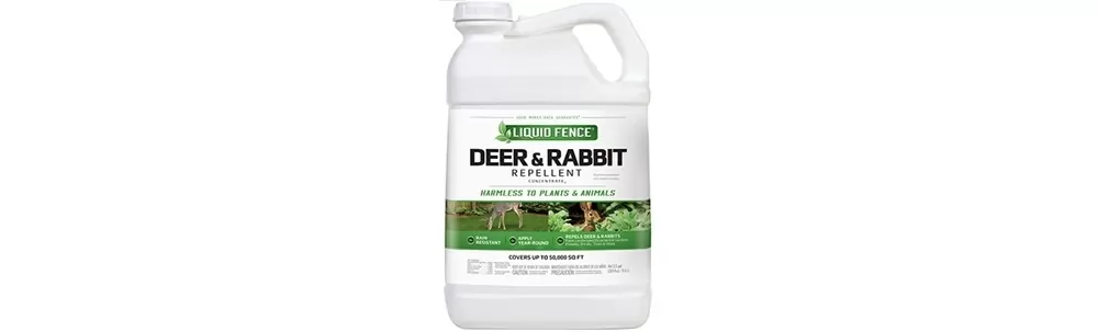 Liquid fence repels deer & rabbits from landscaping garden areas flowers shrubs plants trees and vines. It is all natural biodegradable environmentally safe & will not harm the plants or animals. Product backed by a written 100% guarantee.
