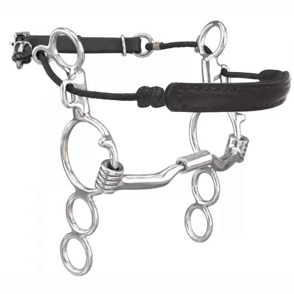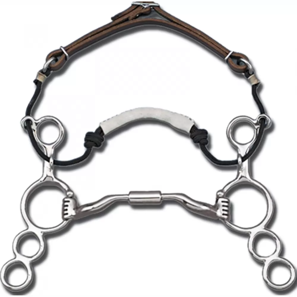 Stainless Steel 3-Ring Combination Bit – 6″ Shank with Sweet Iron Low Port Comfort Snaffle (MB 04, Level 2) Copper Inlay. This mouthpiece is made of polished Sweet Iron which naturally oxidizes or rusts. Harmless to horses, it has a sweet taste and promotes salivation. Now comes with black leather noseband and synthetic black curb strap