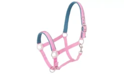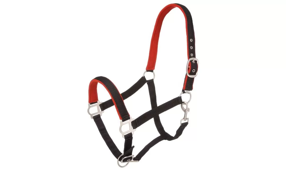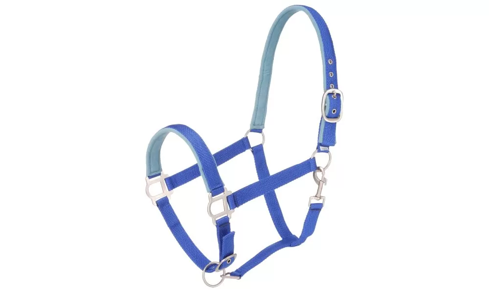 Double ply nylon halter with padded crown and nose. Adjustment at crown and nose. Complete with snap at throat.