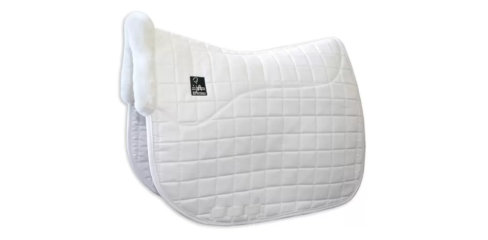 The Steffen Peters Luxury Dressage Pad contains garment quality shearling that is placed under the saddle pressure points and over the withers with a micro-cellular pommel piece for comfort and to prevent slippage.
