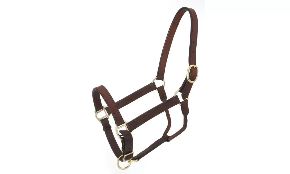 A fine imported handmade halter of full weight leather with handsomely finished edges. Solid brass trimmed with swedge buckle at head. Doubled and stitched cheeks. Adjustable at nose.