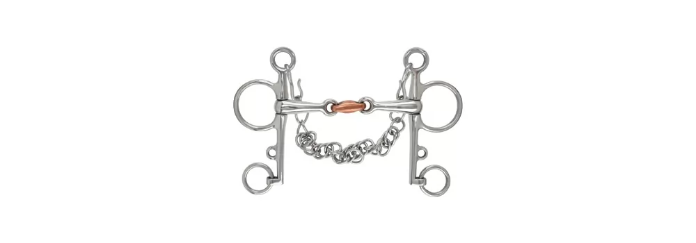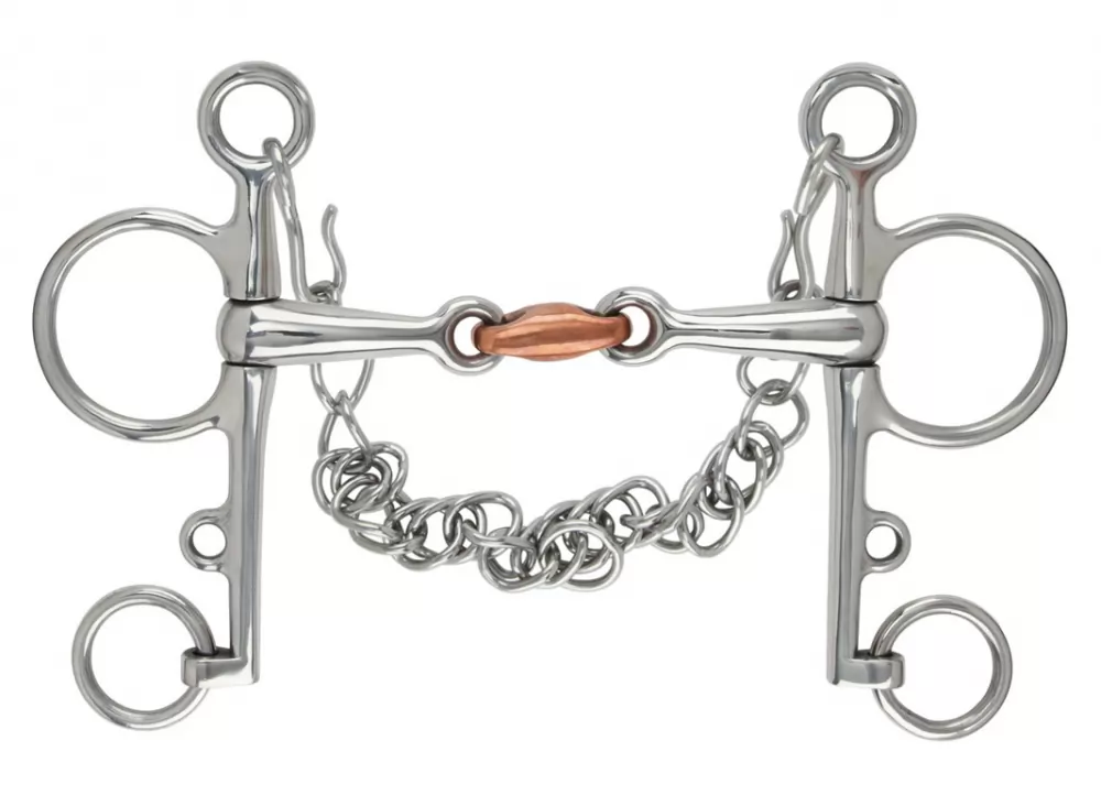 This double jointed pelham is often used to help control, the double joint with copper lozenge will soften the nutcracker action and assist with salivation.