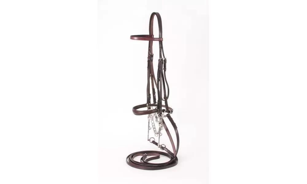 Made of standard quality leather. The ribbon like reins allow the most sensitive contact with the mouth on the horse. Complete with stitched show caveson.