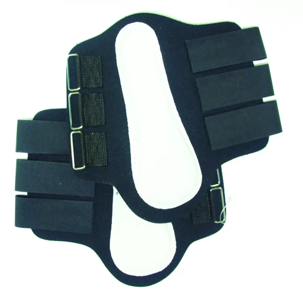 Neoprene Splint Boots with White padded suede overlay and three reverse grip hook and loop straps. Offers good protection to the inside of the horse’s leg. Easy to use, easy to care for. Most 15 to 16 hand horses with average bone wear medium on front, large on back. Sold in Pairs.