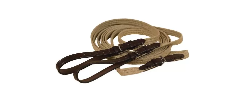 From the original Tory Leather – MADE IN USA. These 18′ (216″) cotton web draw reins have English bridle leather buckle ends for easy on and off.