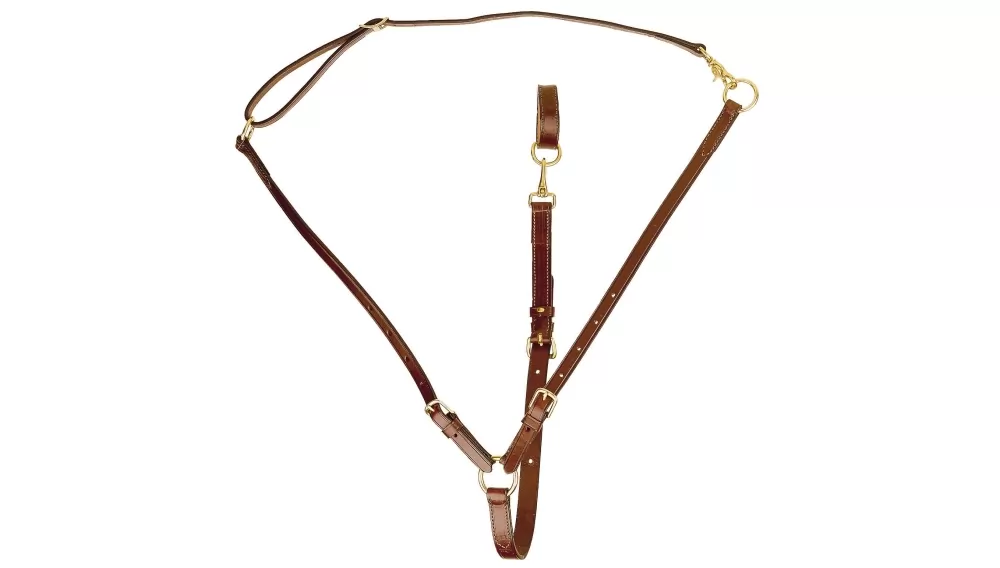 From the original Tory Leather – MADE IN USA. This is a bridle leather training martingale with solid brass hardware and adjustments on the strap for placement of the head and adjustments on the tie down strap.