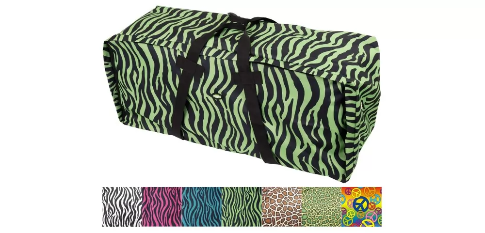 Heavy water repellent poly nylon, full zipper, double handles and two grommets on end for inserting steerhead for roping practice.