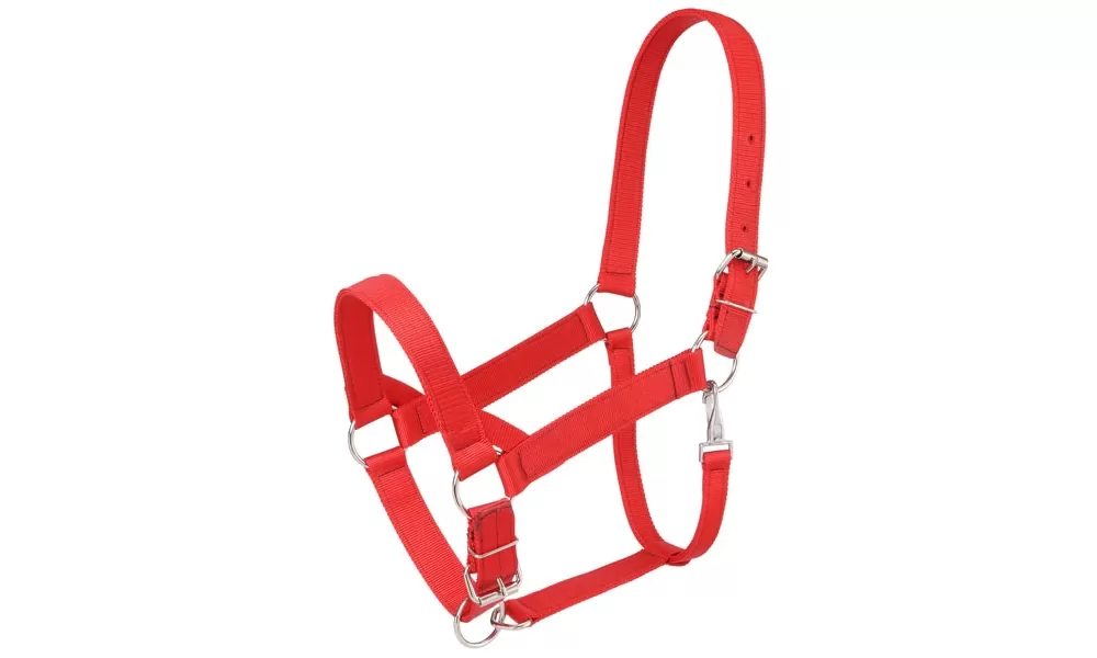 Doubled and stitched nylon with snap at throat and buckle adjustment at crown and nose. Satin hardware.