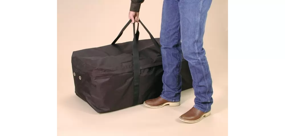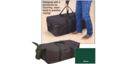 Water repellent heavy poly/nylon. Designed with 2 grommets for inserting steer head or calf head to practice roping. Full zipper. Convenient handles. 40 L x 18 W x 16 H.