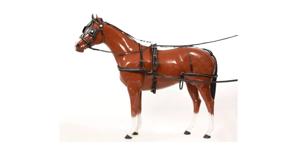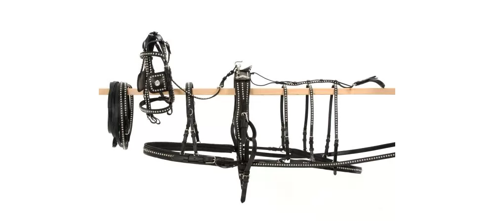 A smart looking single driving harness. Made of quality black leather highlighted with spots. Reinforced throughout, completely finished. Box and cheek bridle, complete with breeching and blinders.