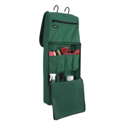 Store your grooming gear or take it on the go with this handy portable grooming organizer from Tough1! Made of heavy denier nylon with a zipper pocket that when opens reveals 7 pouches for storing brushes and bottles. Also features a top zipper pocket and a bottom Quick Grip pouch for smaller items. Metal hooks on top for hanging and an adjustable shoulder strap for easy carrying.