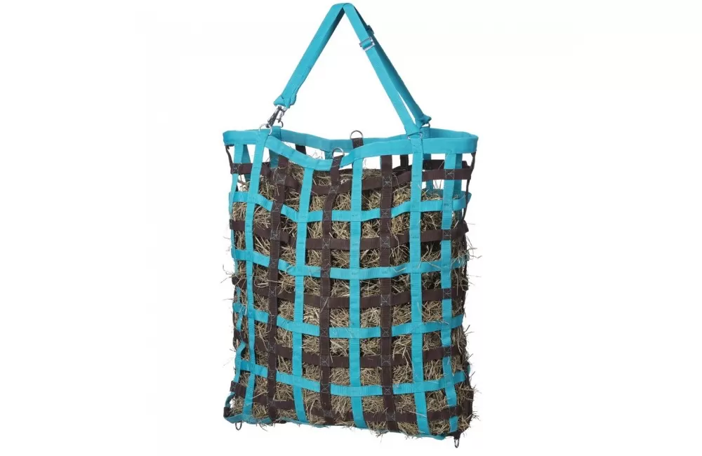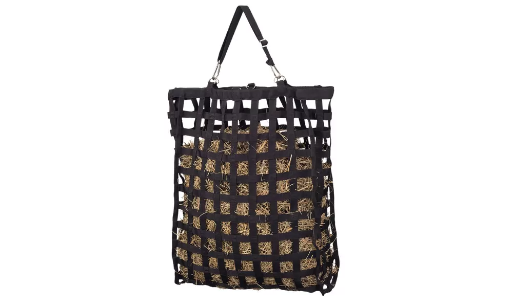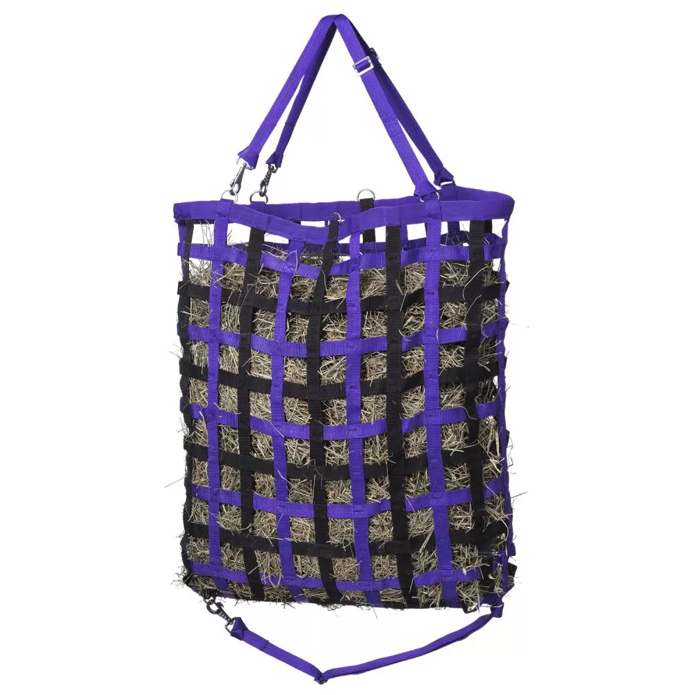 This popular slow feed hay net is perfect for the stall or trailer! Made of durable 1 webbing with small 2 x 2 openings, this net helps to slow down your speedy eater and hay waste. A hidden plastic frame at the top of this net makes loading hay easier. Complete with adjustable hanging straps with snaps and a bottom strap to help secure bag and keep it from twisting or spinning.