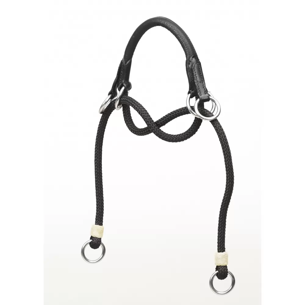 This Bitless Noseband is made with a combination of quality genuine full grain leather, strong braided polypropylene and authentic rawhide accents. The rolled leather section for the nose with rings can attach to any bridle or headstall with the durable braided polypropylene rope straps with rings that your reins attach to. By pulling back on your reins the pressure will increase in the chin and nose provide contact with your horse.