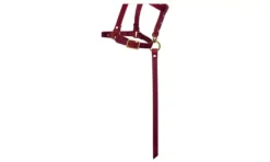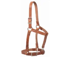 Simple, riveted design is available in burgundy latigo leather, oiled canyon rose harness leather or Hermann Oak russet harness leather for reliable performance. Catch strap on suckling size for ease in catching foals. Nickel plated hardware.