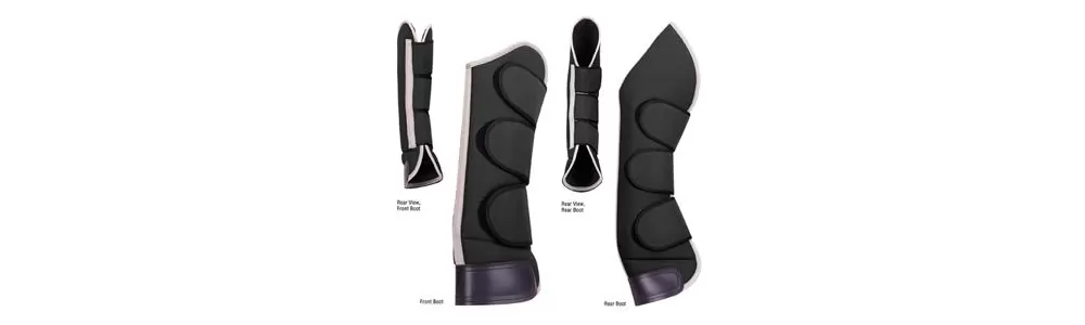 Full-length shipping boots have a 600-denier ripstop nylon outer shell with a synthetic fleece liner. Feature three large Velcro fasteners. Striker plate at bottom boots protects hoof from scuffing. Sold in sets of four.