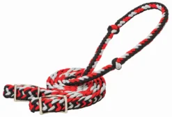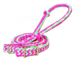 These 1″ flat end braided nylon barrel reins feature easy grip knots for a secure feel in the hands. Nickel plated conway buckle bit ends. Measure 1/2″ x 8′ (1″ wide 32″ back from bit ends).