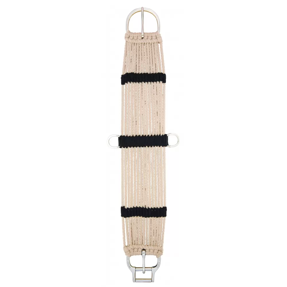 Now featuring the new and improved Roll Snug Cinch Buckle, the Smart Cinch is now smarter than ever! The innovative, patented buckle’s expertly-designed roller system now has less play so your latigo rolls more smoothly than ever. Designed with a contoured lip that keeps your latigo securely positioned, the buckle helps guide you for a straight pull every time. It’s modern, sleek design also features a shaped buckle tongue with a hooked tip that helps keep your latigo locked down in place for added security. White rayon construction features brown accents and nickel plated hardware. U.S. Patent #6,688,086.