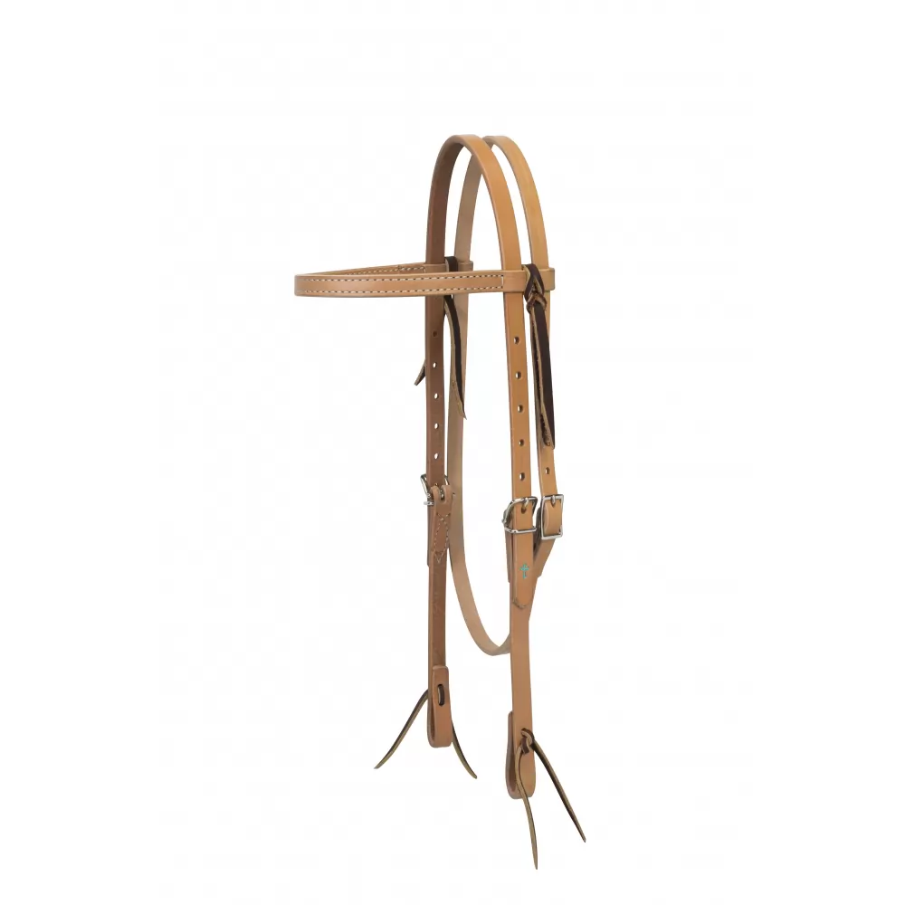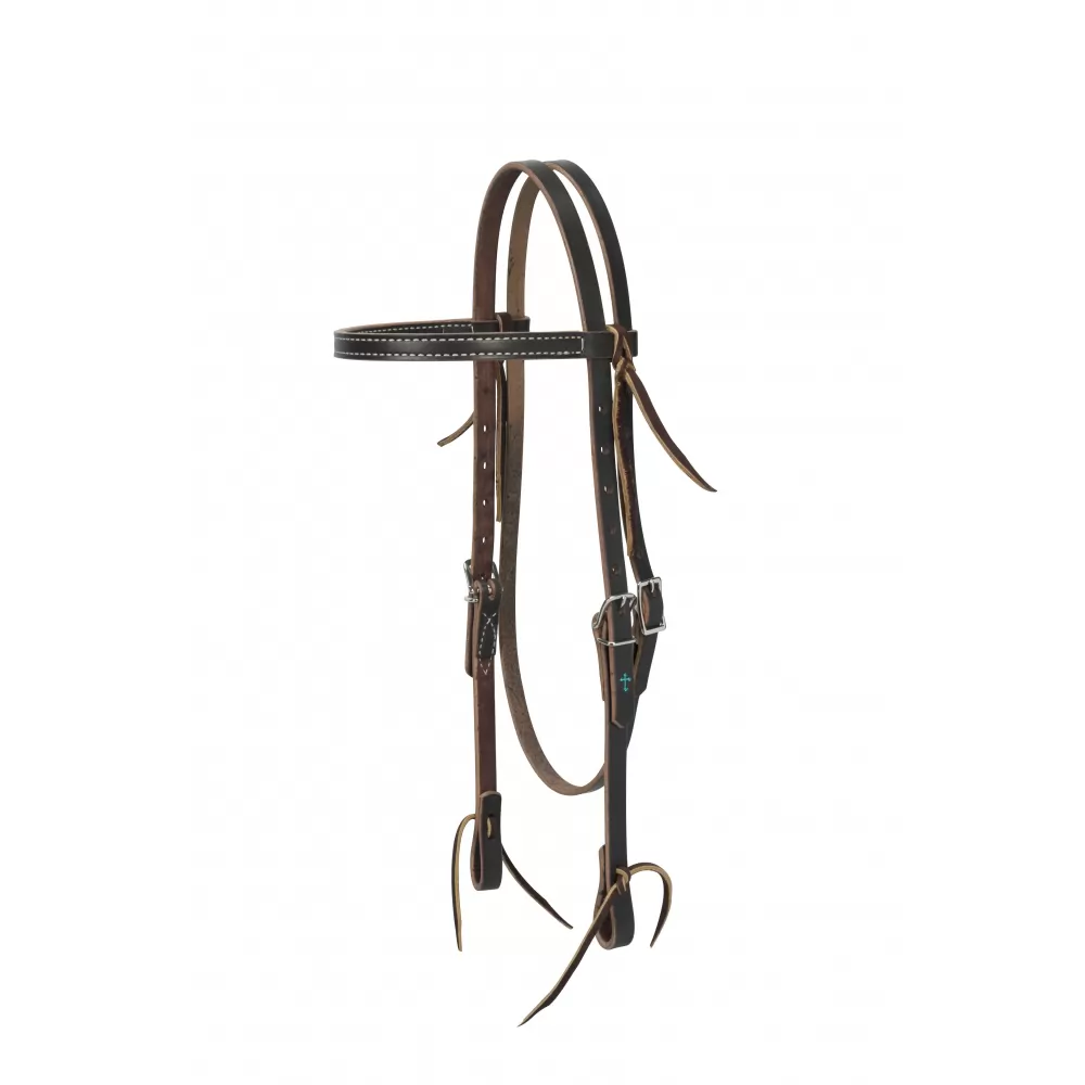 A great essential at a great price, this 5/8″ dark oiled skirting leather browband headstall is perfect for everyday riding. The simple design coordinates with a wide range of saddles and other tack. Water tie bit ends. Durable nickel plated hardware.