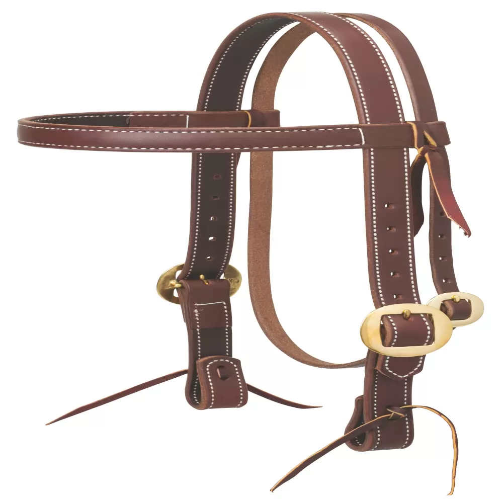 Weaver’s Working Cowboy Browband Headstall is made of extra heavy harness leather that has been dipped in oil, dressed with saddle butter and hand rubbed for the ultimate in performance and rich golden chestnut color. This doubled and stitched browband headstall features lower buckle placement for your horse’s comfort. Ideal for trail, working, and everyday use. Ties at browband and bit ends. Brass or Stainless Steel hardware.