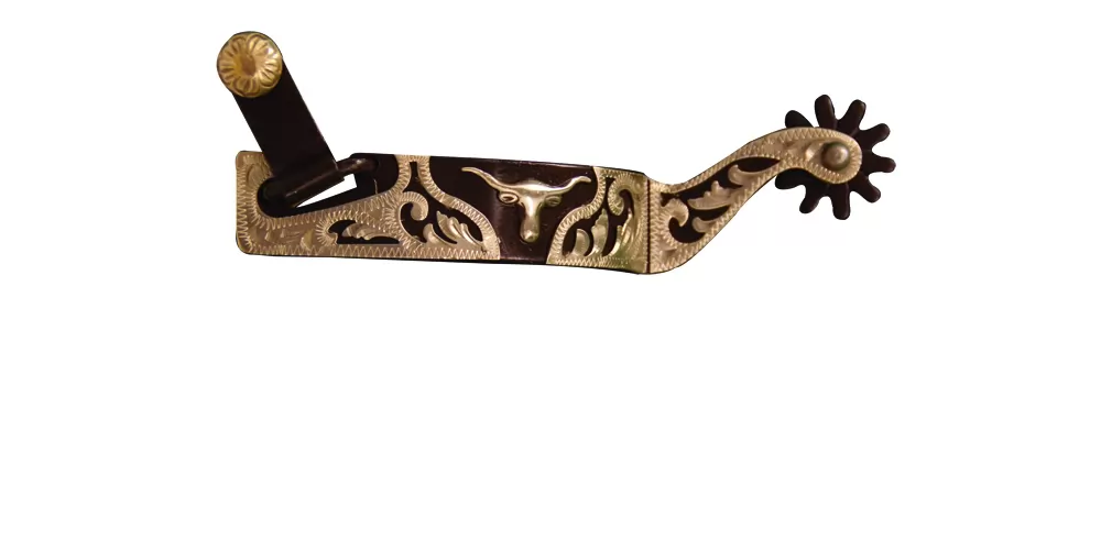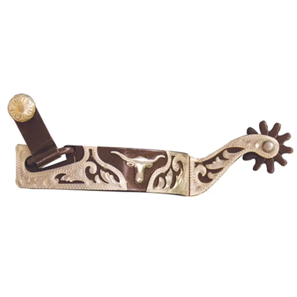 The Intrepid Western Antiqued Silver Steer and Overlay Show Spurs feature a silver steer design with overlay. Perfect for trail or the show ring, these functional spurs look great and add a bit of flair. Average size.
